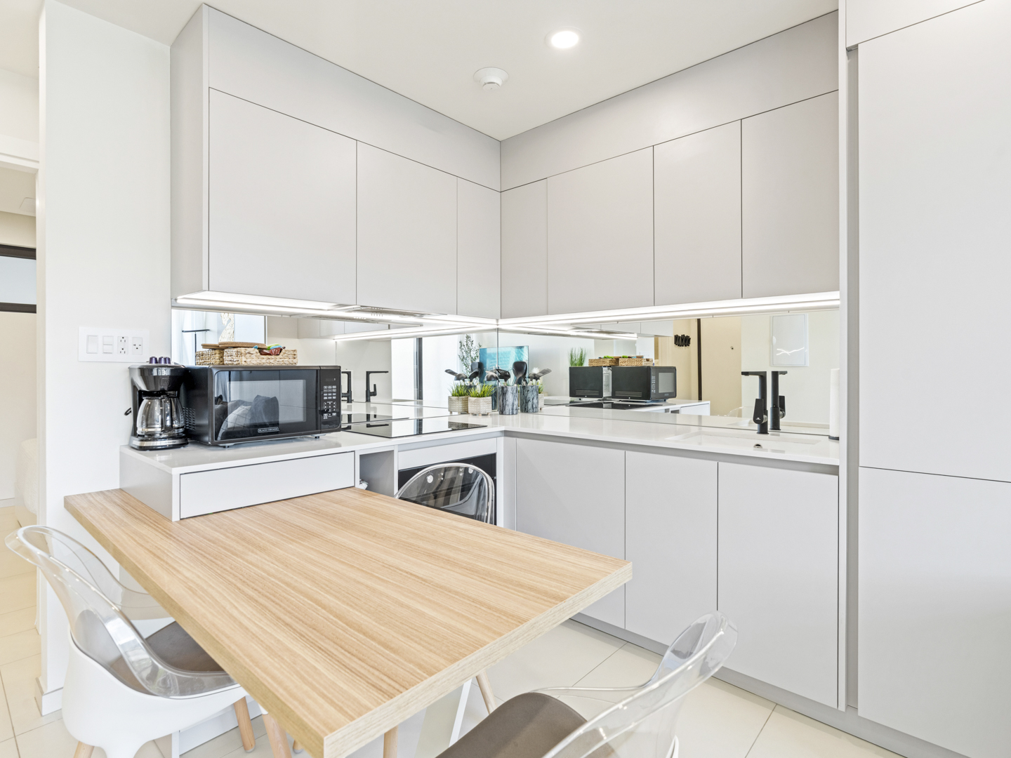 La cuisine moderne entièrement équipée est prête à tout, des petits déjeuners rapides aux dîners gastronomiques. Des appareils de pointe et une disposition fluide garantissent que chaque expérience culinaire soit un plaisir, tout en restant connecté à l’espace de vie.