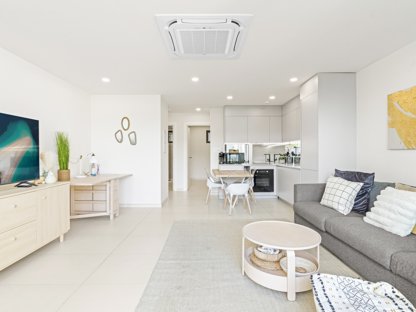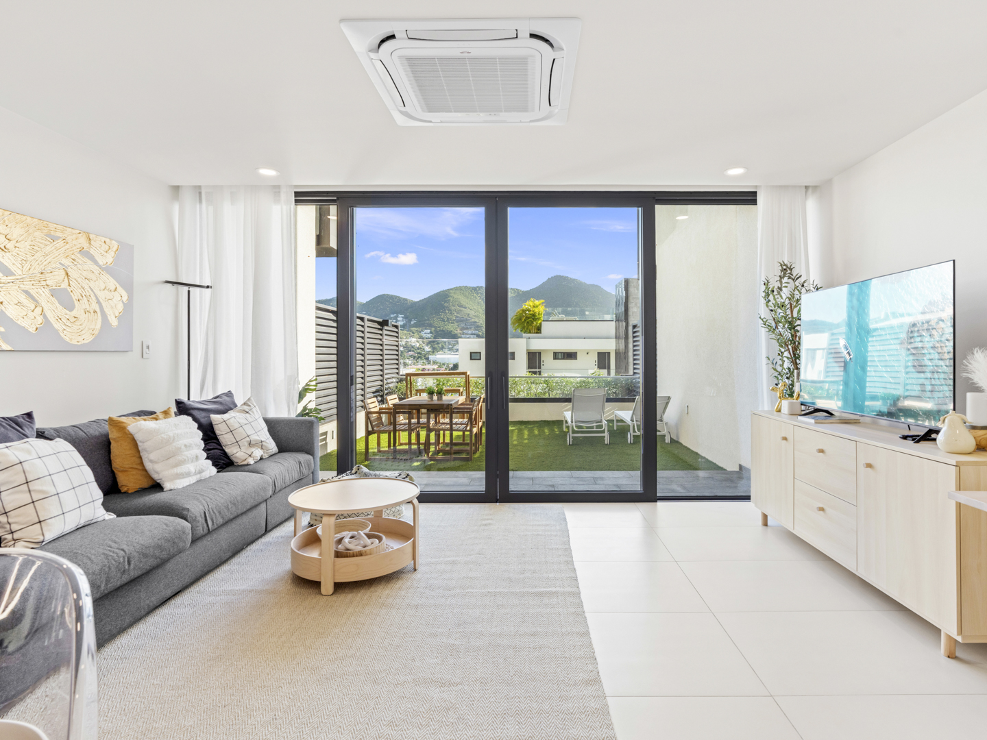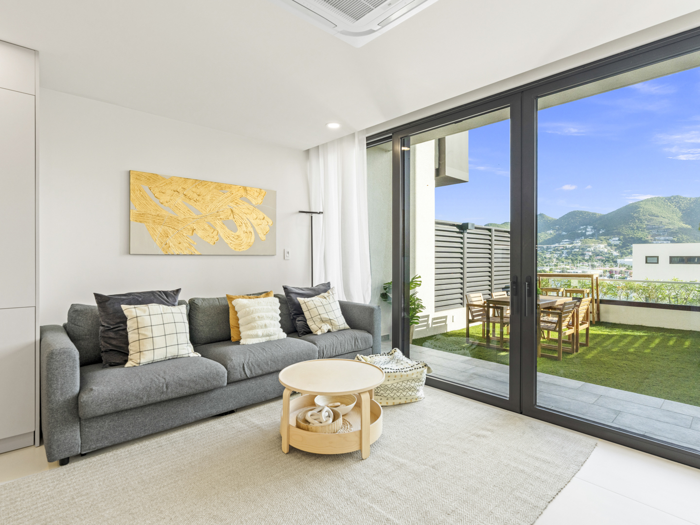 Ce qui distingue véritablement le B206, c’est sa vaste terrasse extérieure, la plus grande du Bâtiment Deux. Imaginez-vous en train de vous détendre sur des chaises longues confortables, de siroter un cocktail au bar haut, ou de savourer un repas en plein air, tout en admirant la vue sur la lagune sereine et les collines environnantes. C’est votre sanctuaire privé pour des couchers de soleil inoubliables et des soirées étoilées.