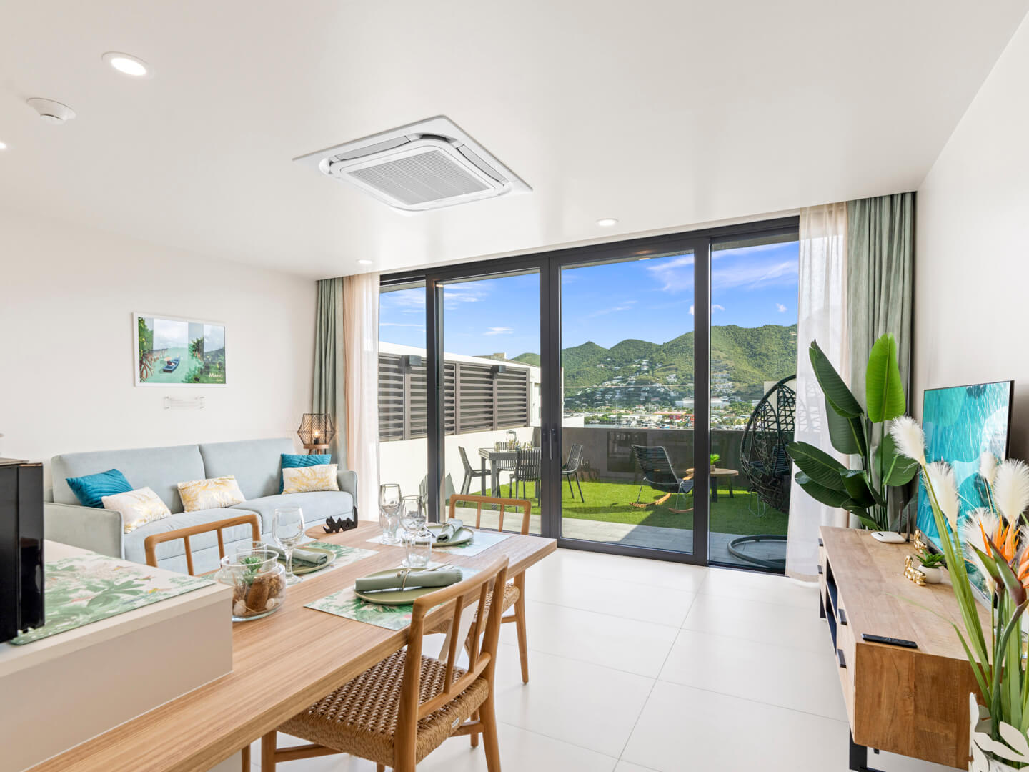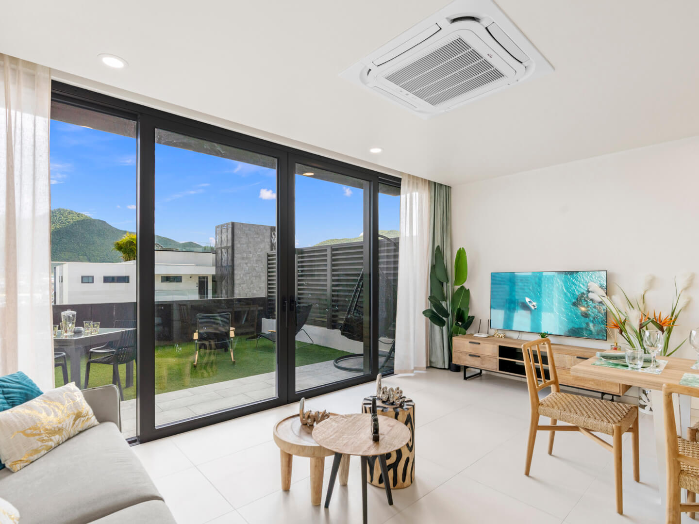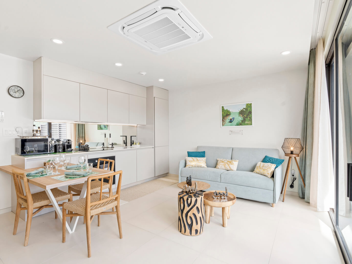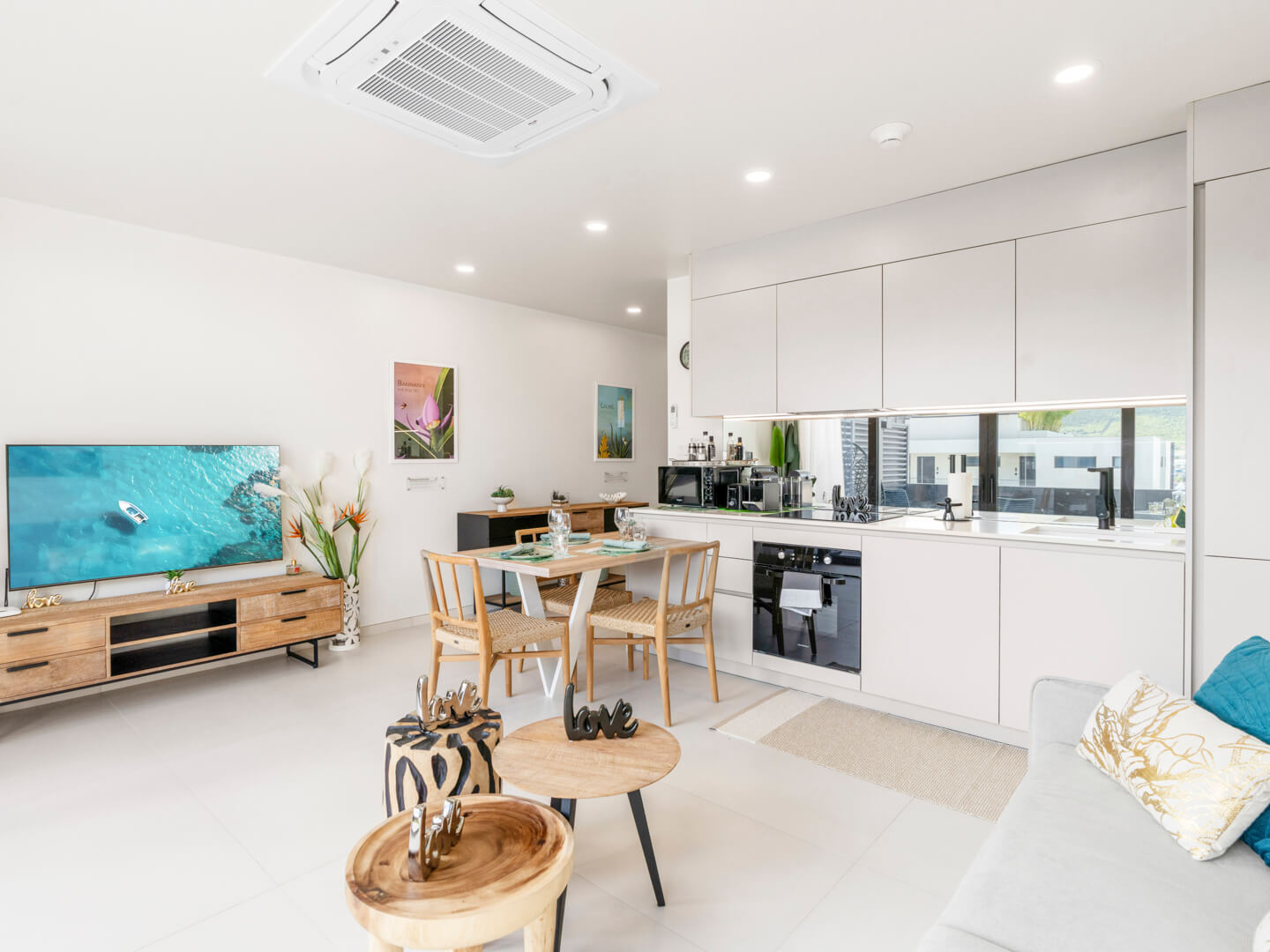 En entrant dans le B207, vous êtes accueilli par un intérieur soigneusement conçu qui allie esthétique moderne et charme cosy. Le salon à aire ouverte est décoré avec des meubles chics et baigné de lumière naturelle, favorisant une atmosphère accueillante, idéale pour se détendre après une journée d’exploration de l’île.