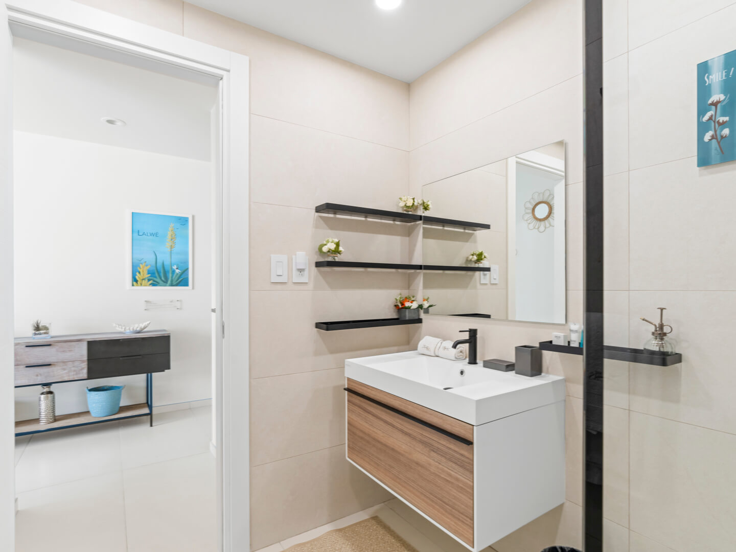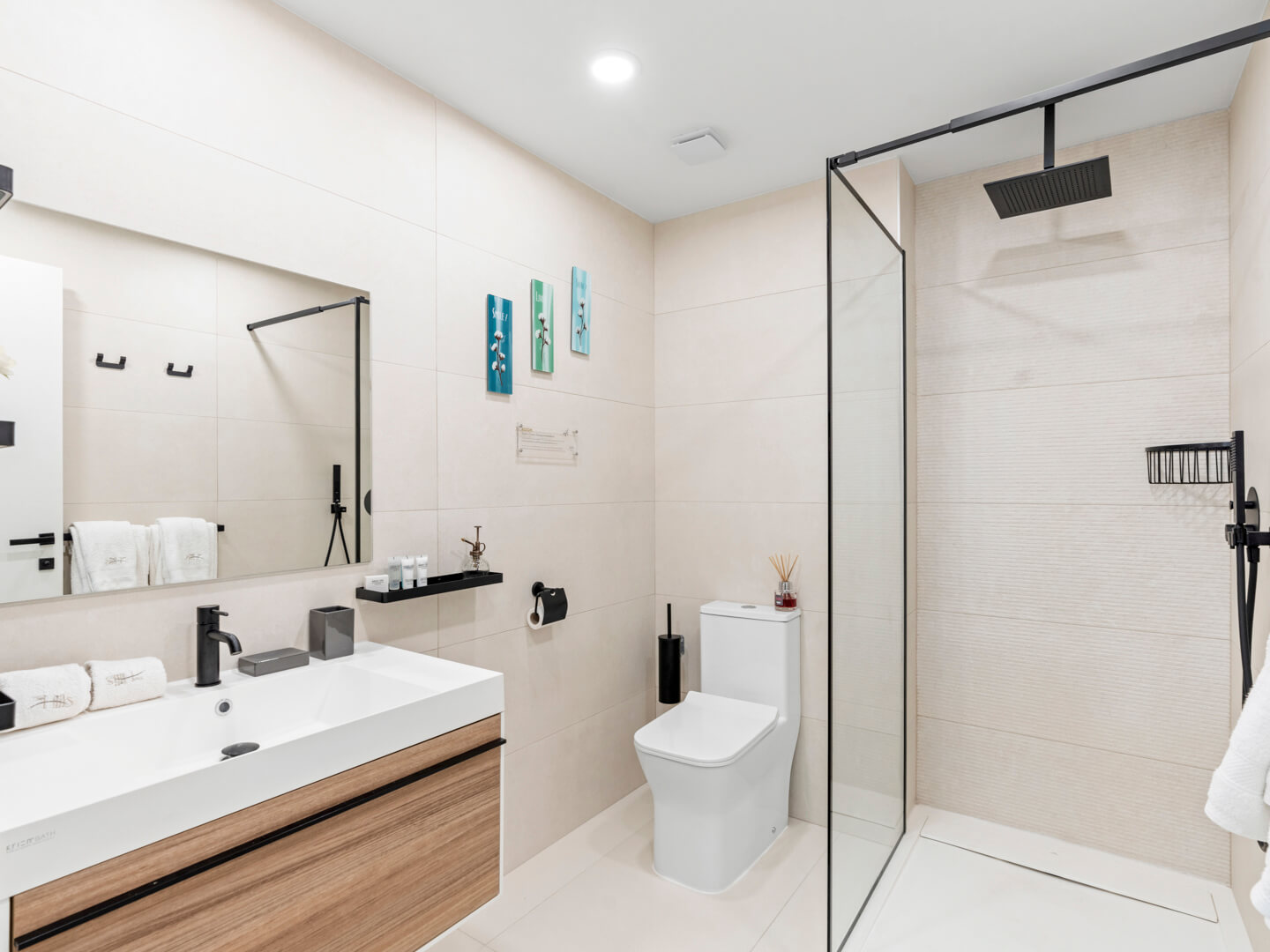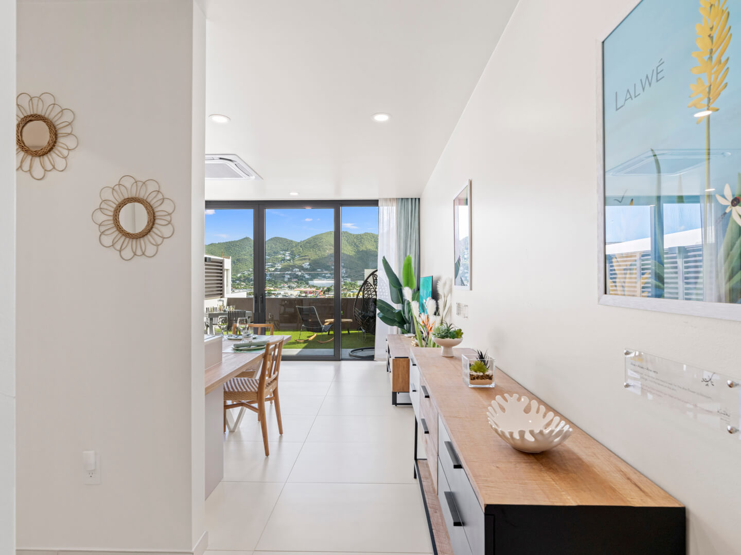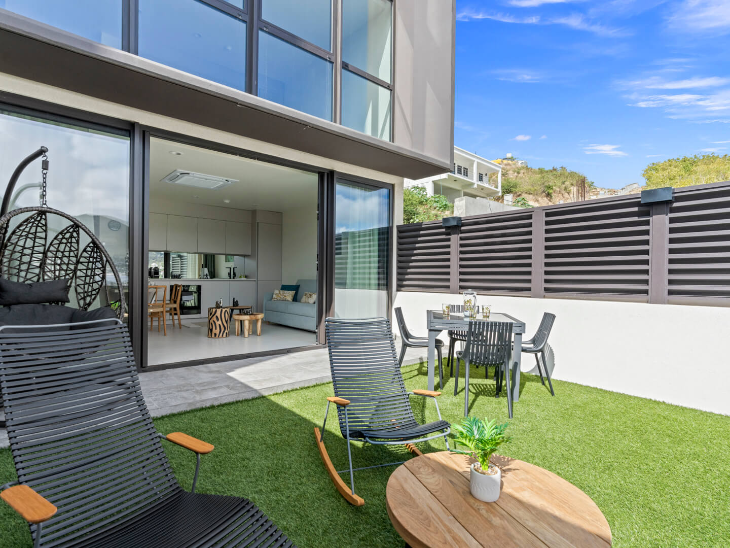 En entrant dans le B207, vous êtes accueilli par un intérieur soigneusement conçu qui allie esthétique moderne et charme cosy. Le salon à aire ouverte est décoré avec des meubles chics et baigné de lumière naturelle, favorisant une atmosphère accueillante, idéale pour se détendre après une journée d’exploration de l’île.