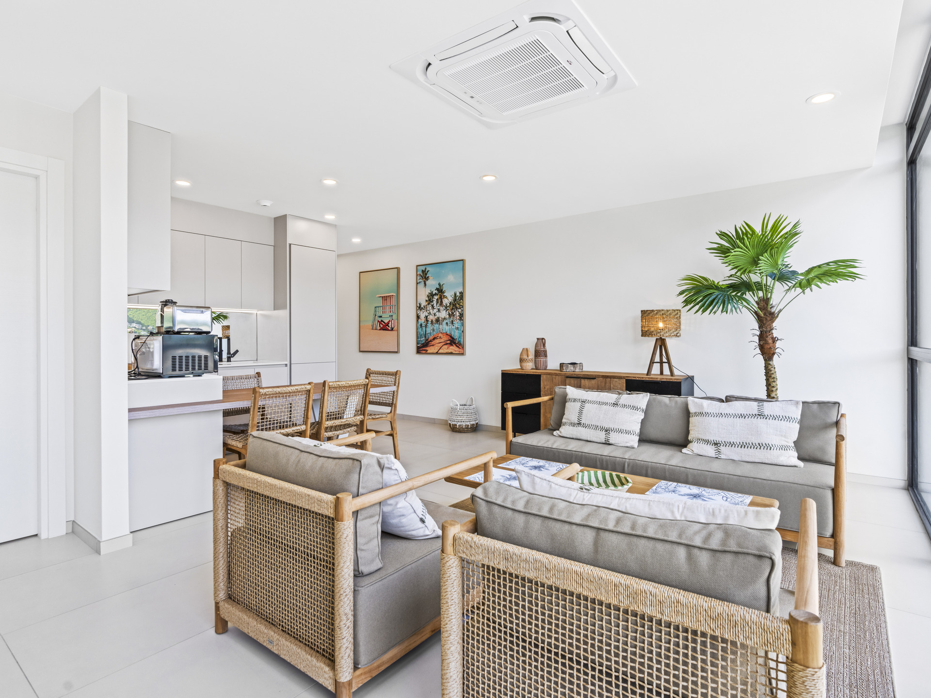 Le salon spacieux est idéal pour recevoir ou simplement se détendre. Le mur de verre panoramique offre une vue à couper le souffle sur la lagune, créant une ambiance magique et paisible. Imaginez-vous savourer votre café du matin tout en observant le lever du soleil sur les eaux scintillantes de la lagune.