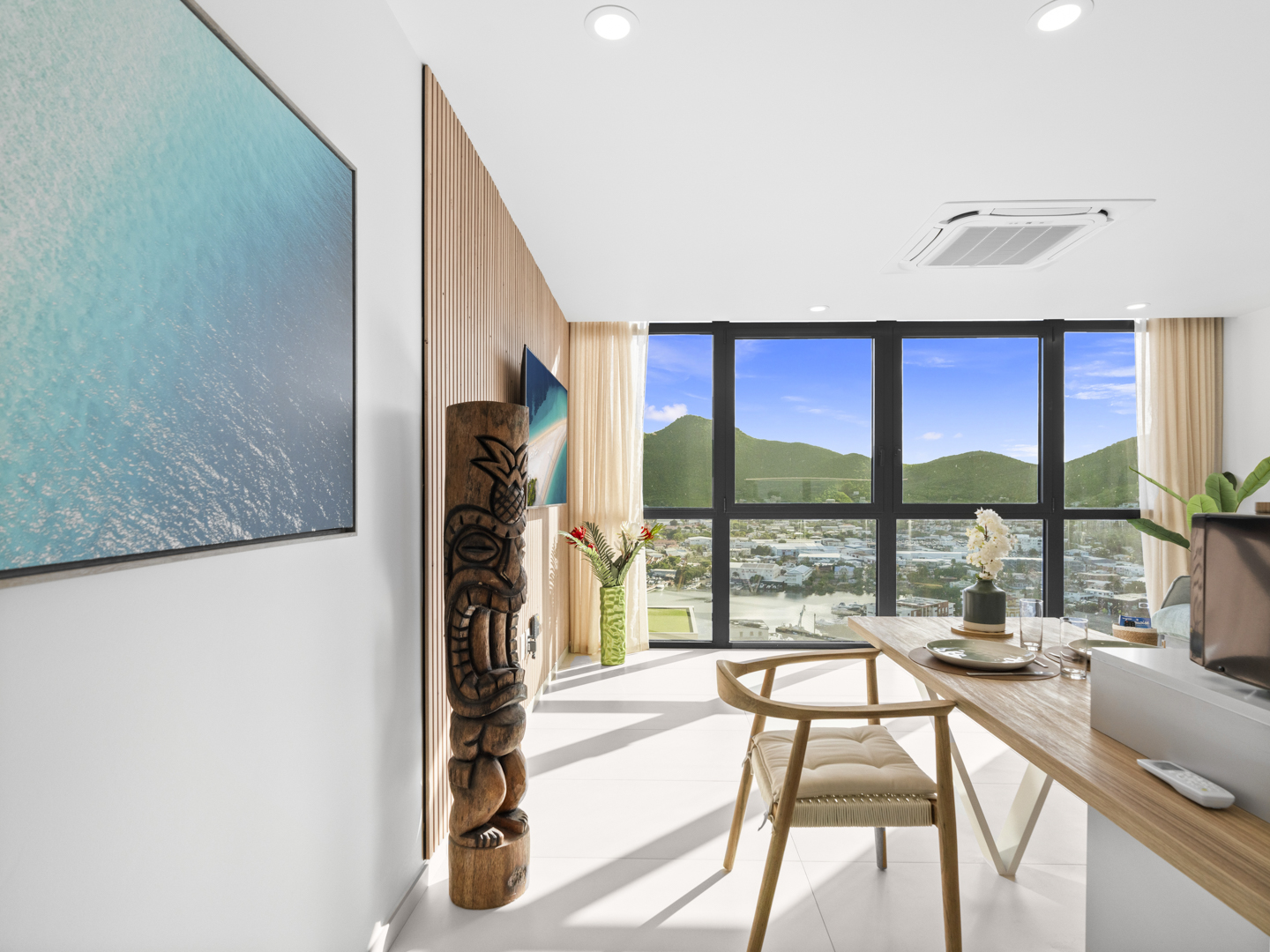 A121 is designed to impress, offering a spacious, modern interior complemented by large windows that fill the space with natural light. The real showstopper? An amazing panoramic view that captures the tranquil beauty of Simpson Bay Lagoon and the lush hills beyond. Whether you’re enjoying a quiet morning coffee or winding down in the evening, this stunning vista is always on display.