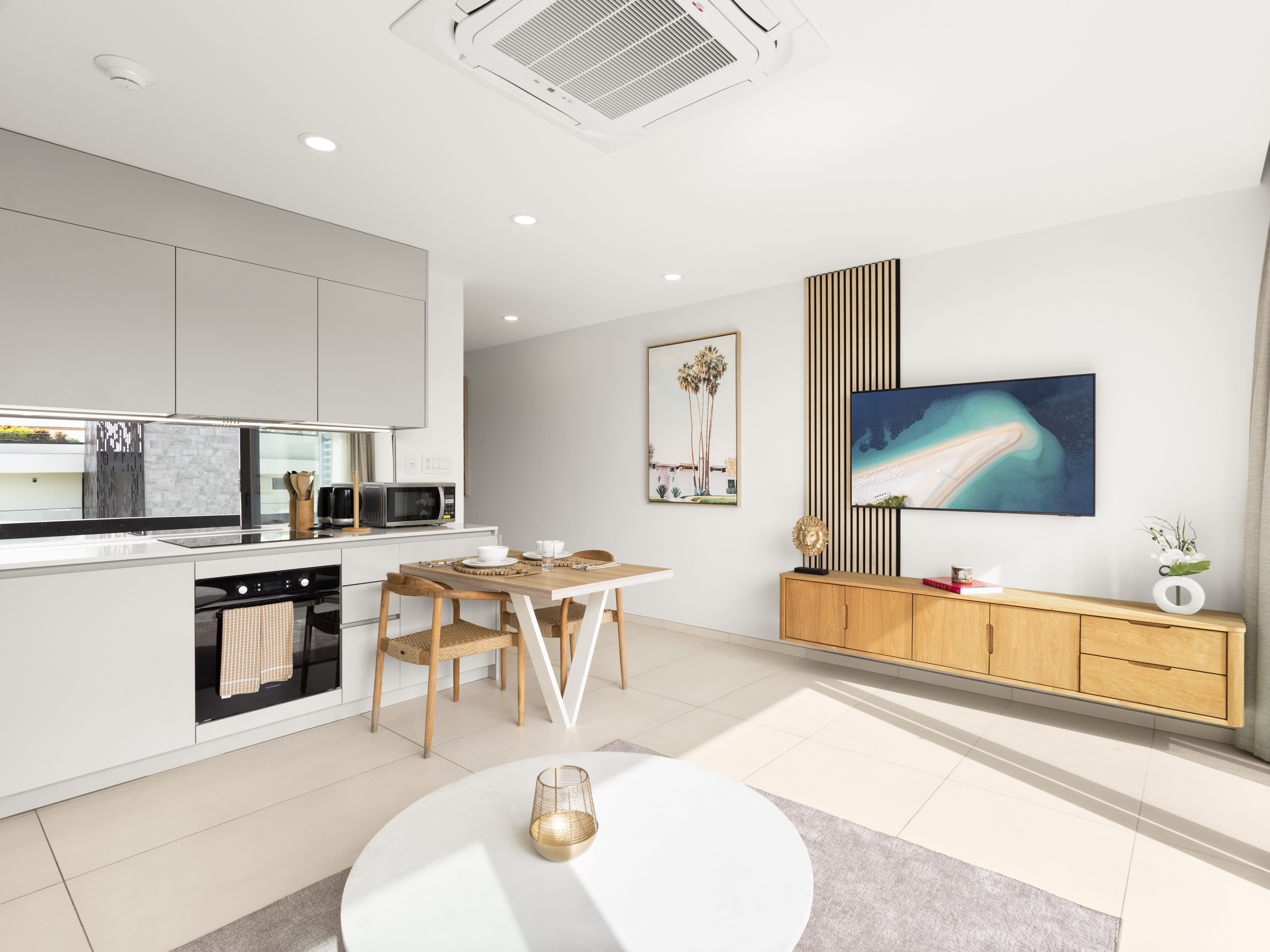 Located on the ground floor of Building 2, Apartment B-203 immediately welcomes you with its clean, airy atmosphere and understated Caribbean charm. The open-concept living area offers plenty of natural light, a cozy sofa, and a TV for your downtime. It’s a space where you can kick back after exploring local beaches or relax with a quiet dinner and your favorite show.
