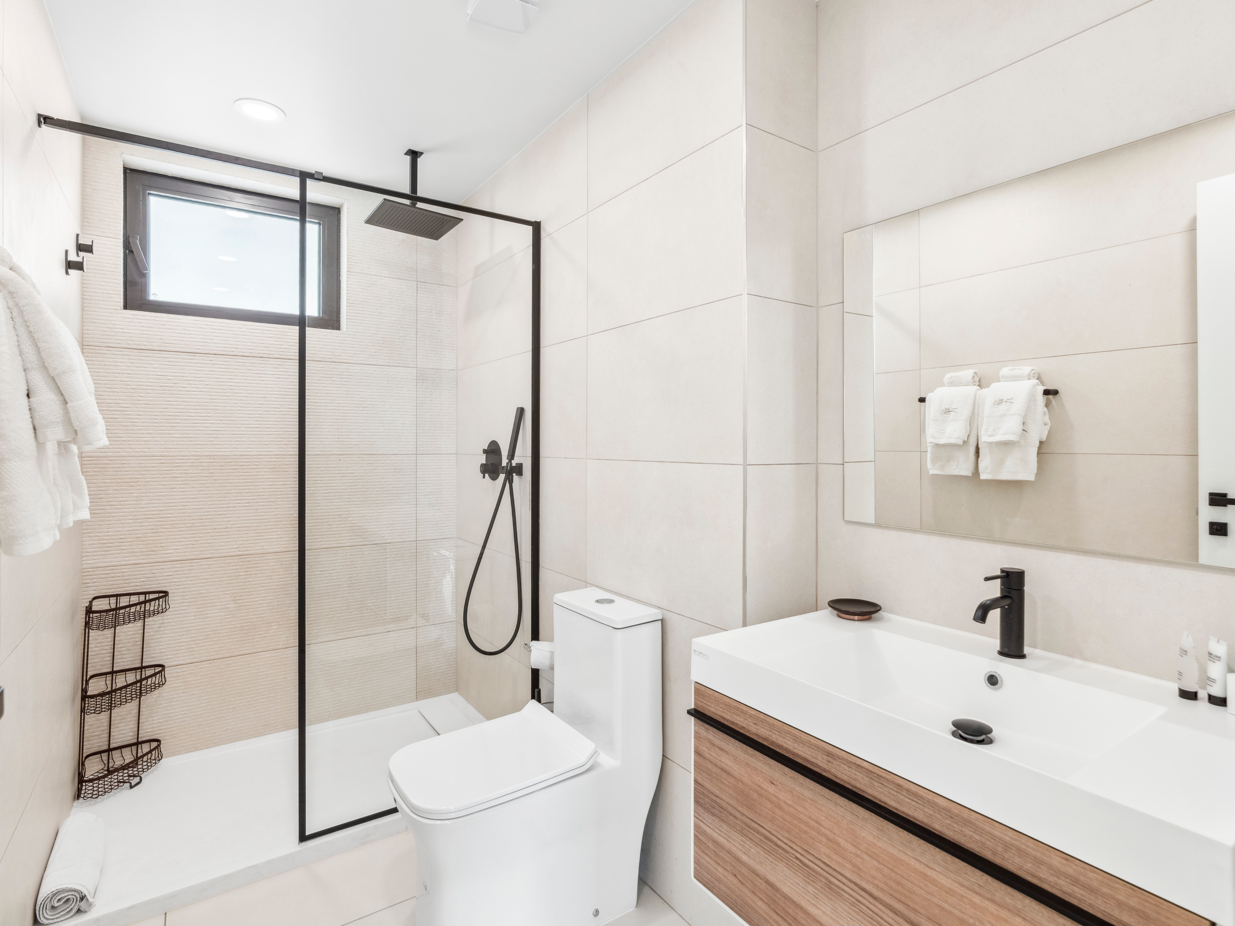 Inside, the bright open-plan living space blends contemporary design with everyday comfort. Large windows flood the apartment with natural light, while the fully equipped kitchen and cozy dining area make it easy to feel at home. The bedroom is a peaceful sanctuary, complete with a plush bed, smart TV, and ample storage, while the sleek bathroom offers a spa-like rain shower.