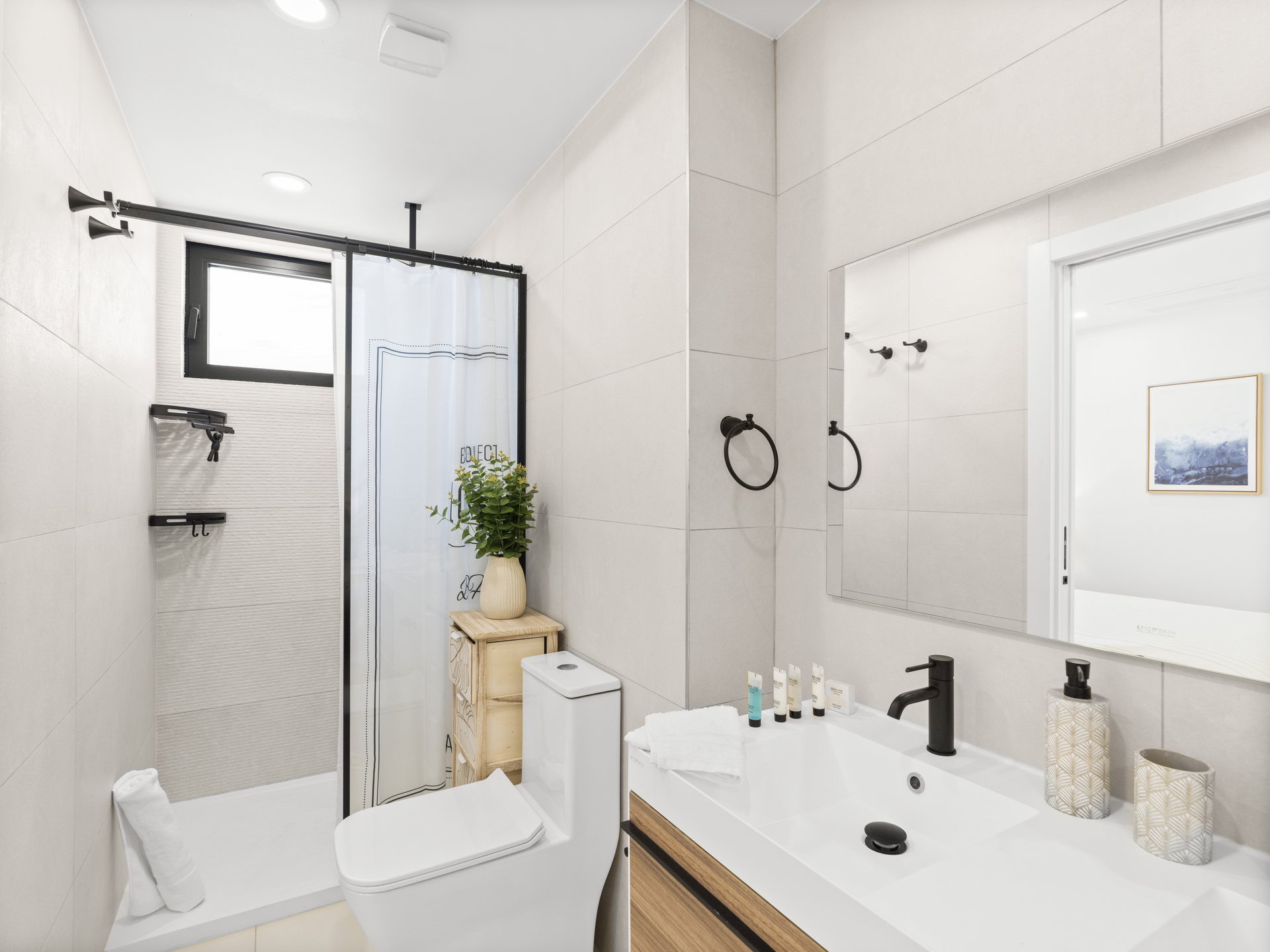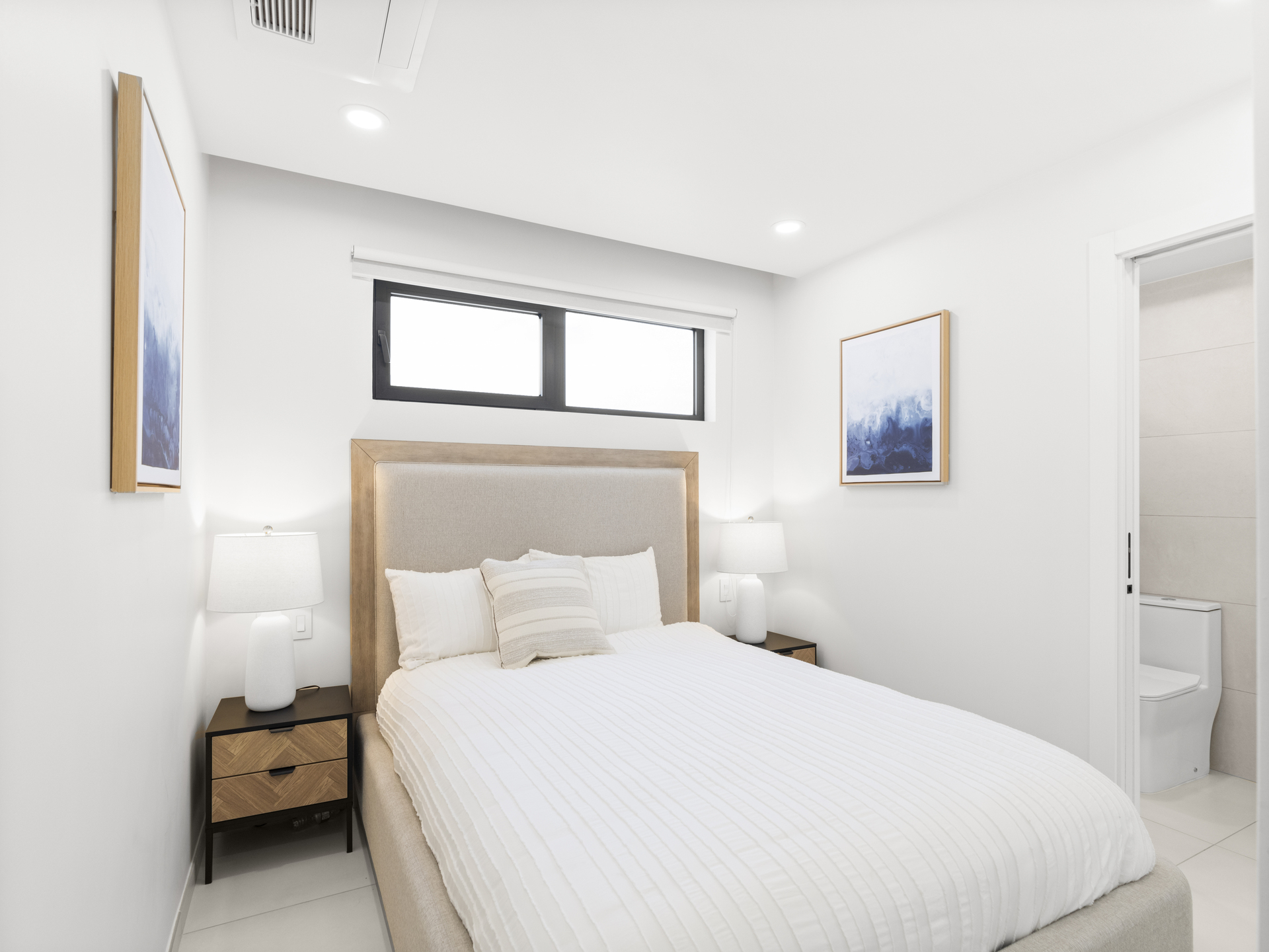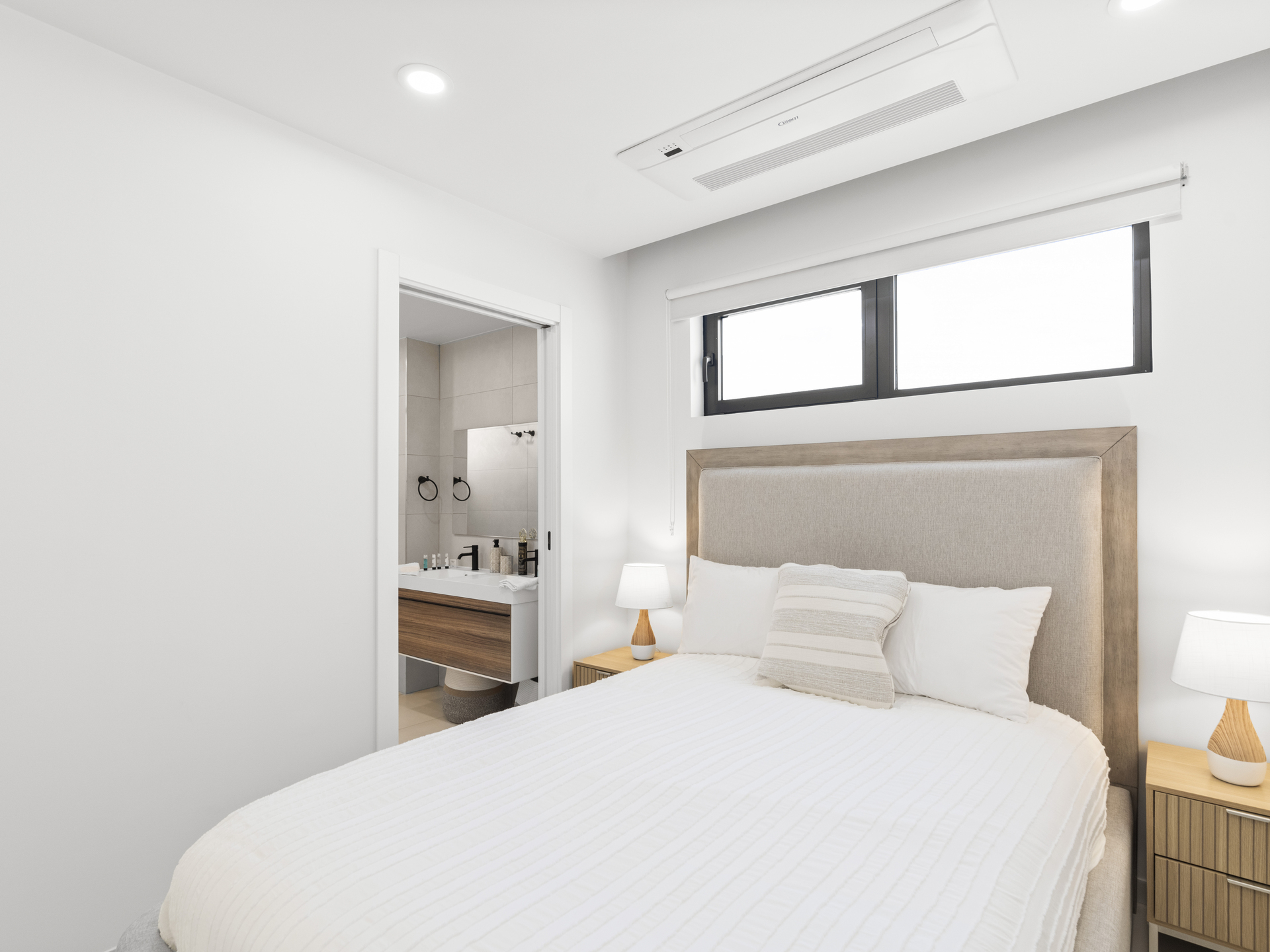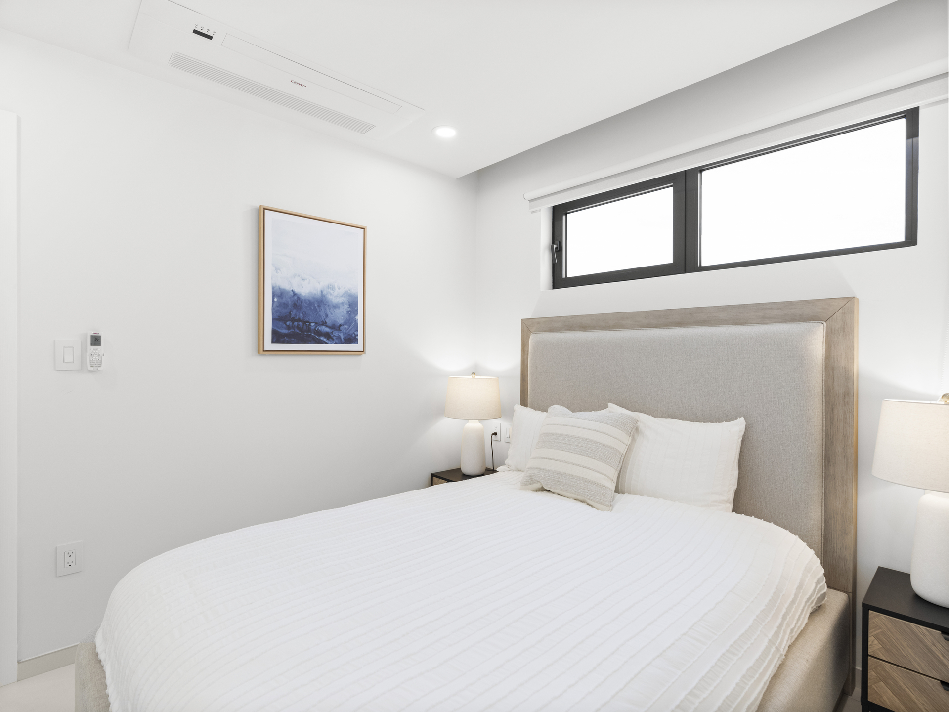 Both bedrooms offer plush bedding and ample storage, ensuring restful nights and easy living for longer stays. The modern bathroom features elegant finishes, including a rain shower and double vanities for a spa-inspired experience.