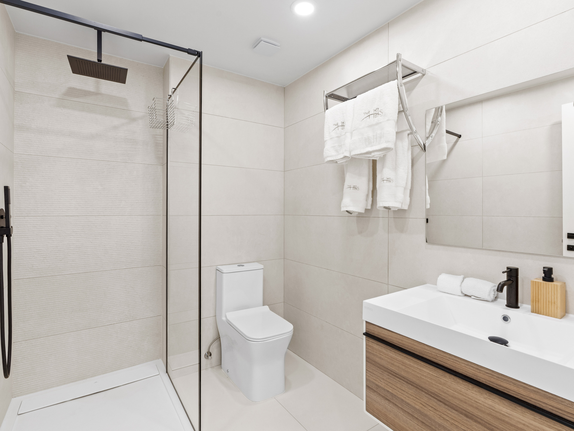The modern kitchen is equipped with premium appliances, sleek cabinetry, and ample counter space, making it a joy to prepare meals at home. The bedroom is a tranquil retreat designed for comfort, while the bathroom offers a spa-like atmosphere with elegant finishes and a luxurious rain shower.