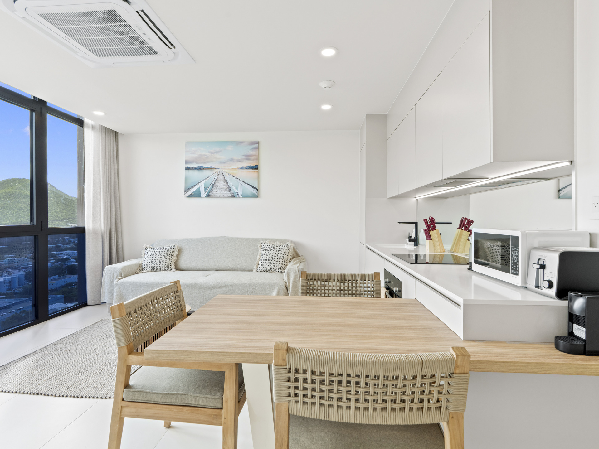 Perched on the 3rd floor of Building 4, this sophisticated home offers spectacular views of the ocean, Anguilla, the lagoon, and the lush surrounding mountains, creating a serene and luxurious living experience.