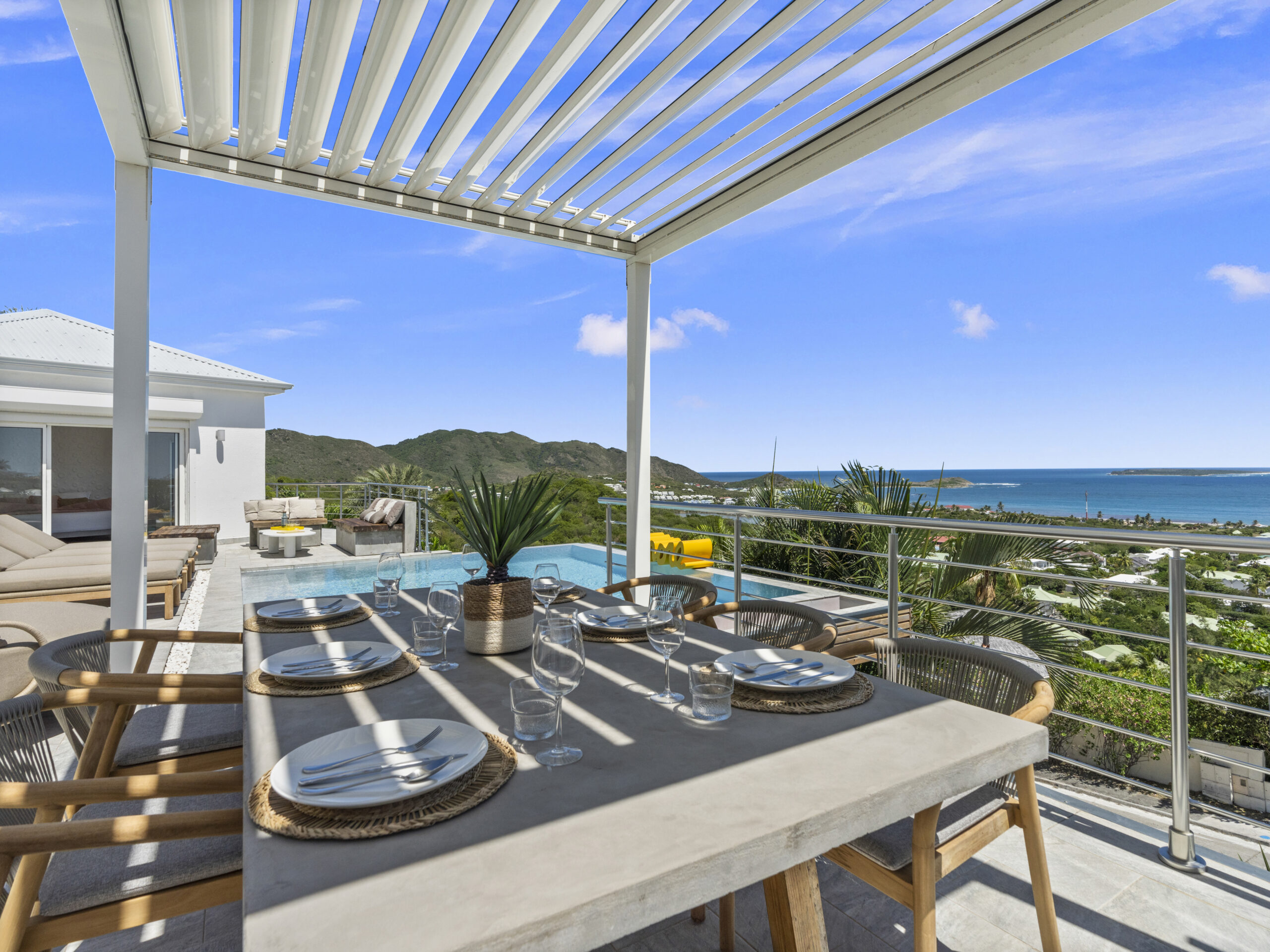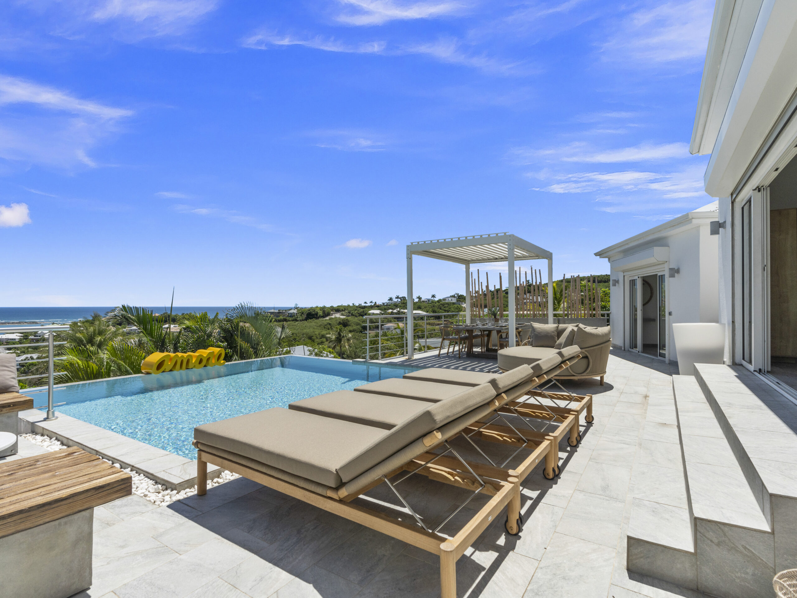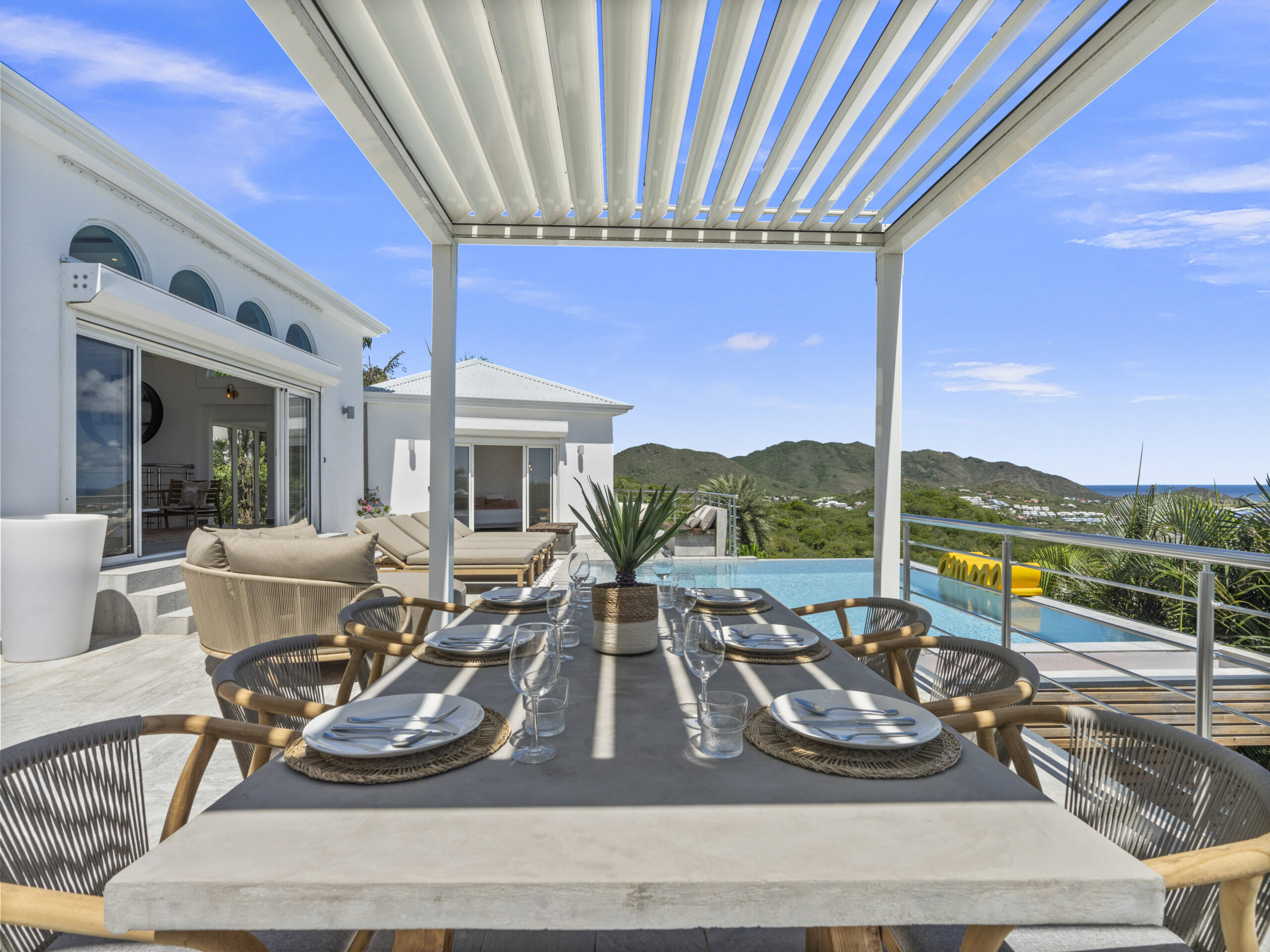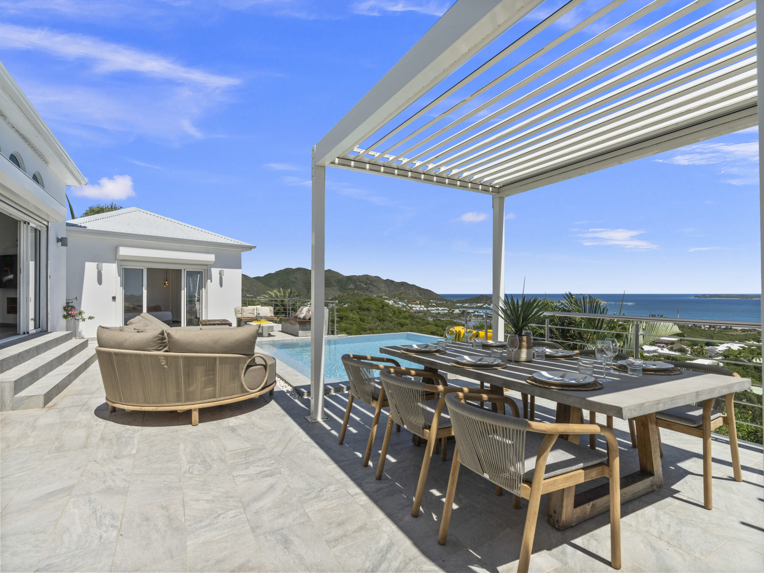 Situated at the top of the hill, this luxurious villa provides a panoramic spectacular view of Orient Beach. Imagine waking up to vibrant sunrises over the turquoise waters or sipping a glass of wine on the terrace as the sun sets over the horizon. This breathtaking scenery sets the tone for a truly serene and memorable stay.