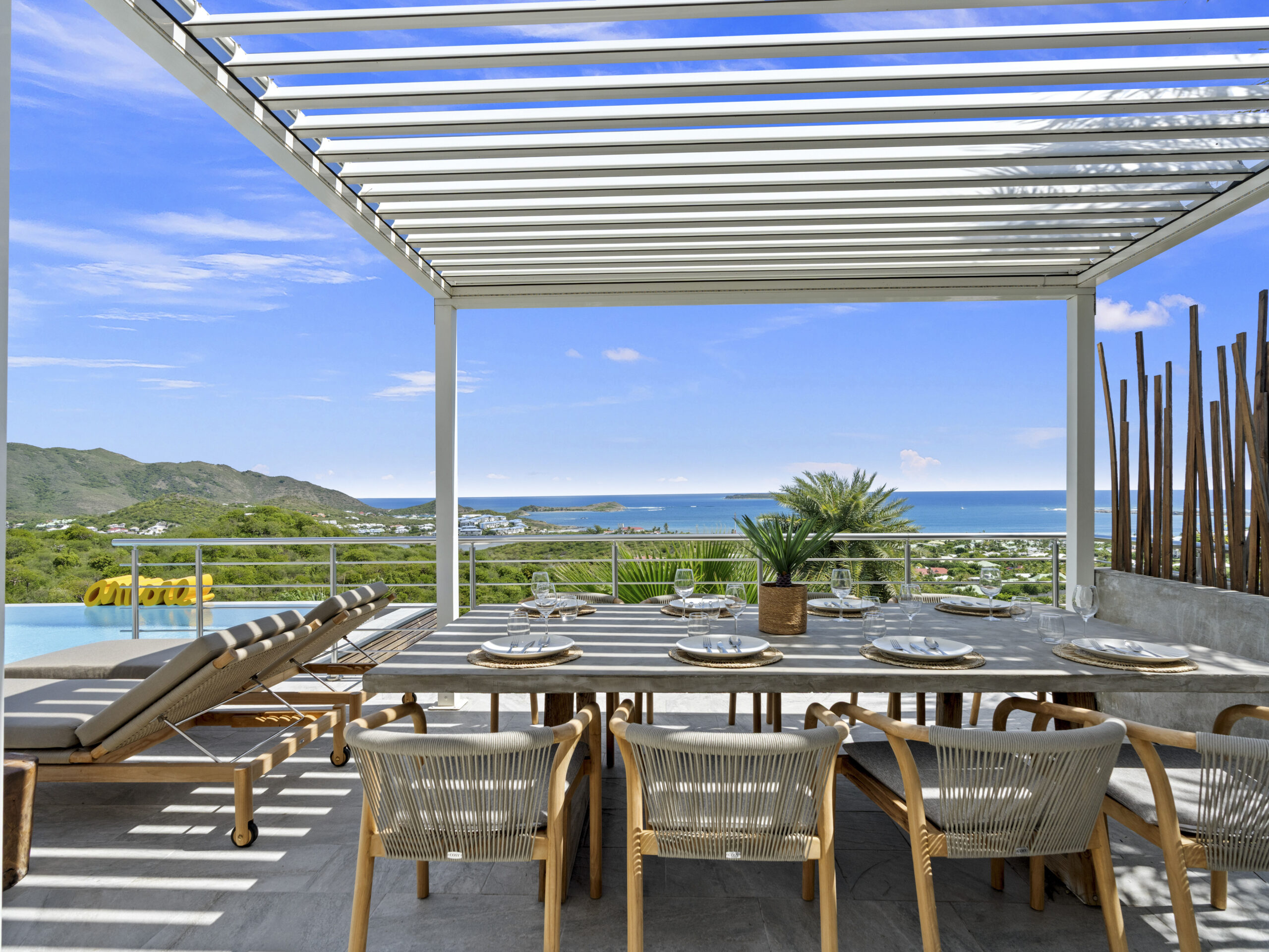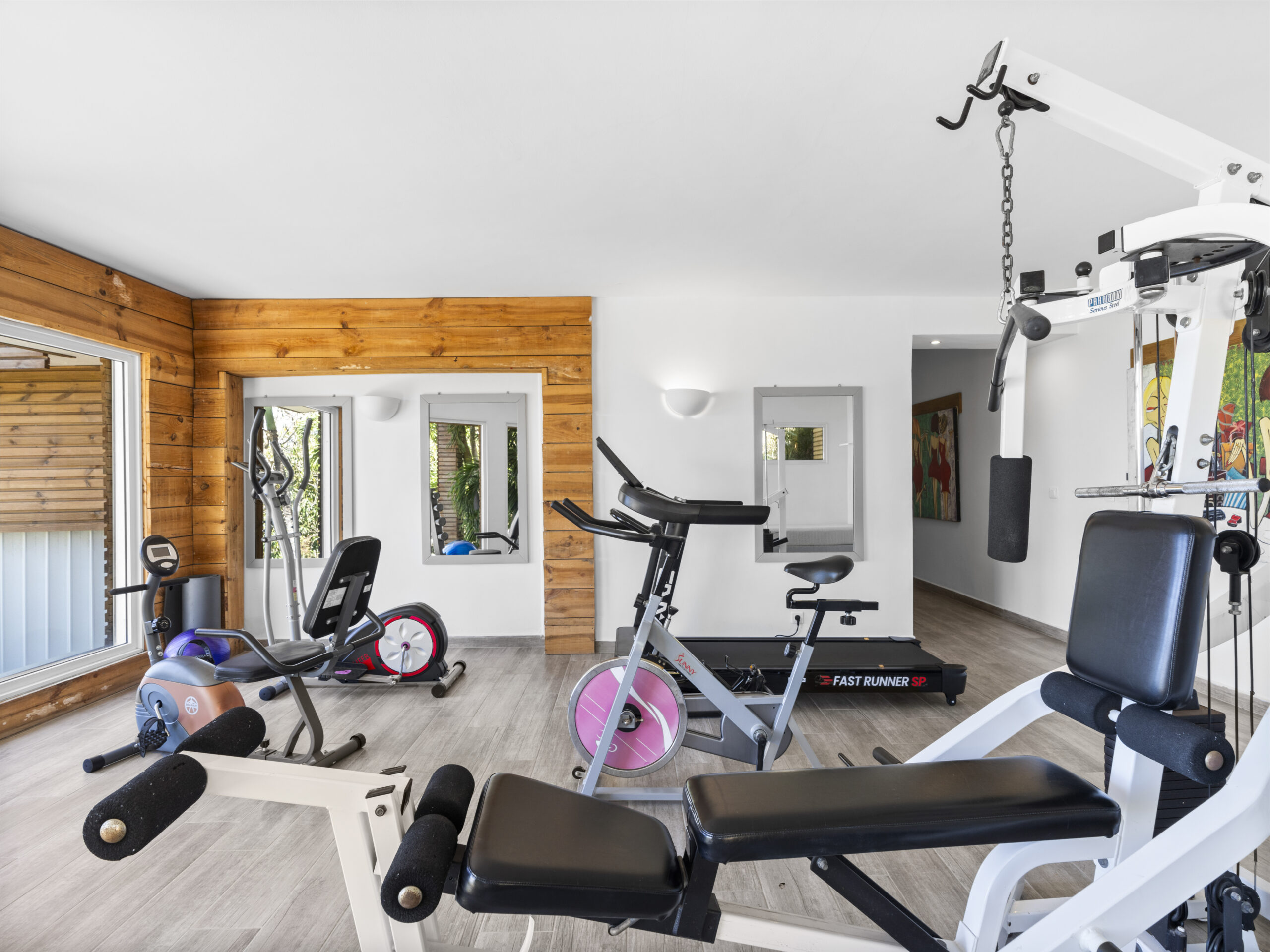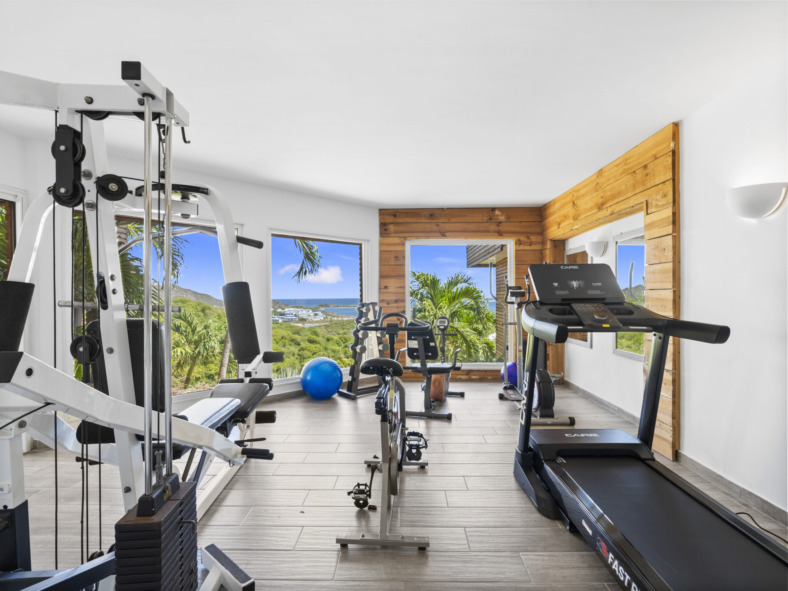 The villa also boasts a fully equipped private sports room, perfect for keeping up with your fitness routine while away. Afterward, unwind on the spectacular modern terrace, complete with pergolas, a barbecue, and breathtaking views of the Caribbean Sea.